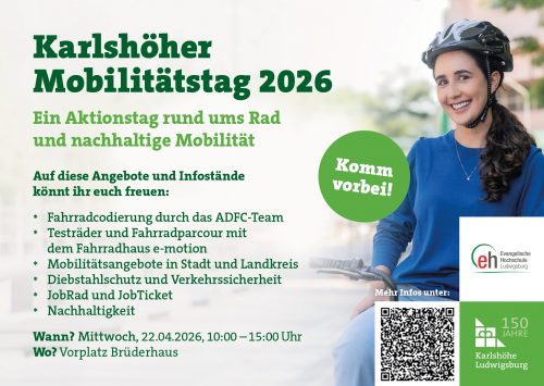Am Mittwoch, den 22. April 2026, lädt die Karlshöhe von 10:00 bis 15:00 Uhr zum Mobilitätstag auf den Vorplatz und den Parkplatz hinter dem Brüderhaus ein. Der Aktionstag rund ums Rad und nachhaltige Mobilität bietet zahlreiche Mitmachangebote, Informationsstände und praktische Services für Mitarbeitende und Studierende.